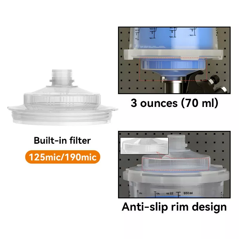 - AYS3.1 တစ်ခါသုံးဖြန်းဆေးခွက်အဖုံးသည် ဇကာအောက်ရှိ 3 အောင်စ (70 မီလီလီတာ) အထိ သုတ်ဆေးများကို ထိန်းထားနိုင်သော အလွှာနှစ်ထပ်တည်ဆောက်မှုပါရှိသည်။ အဖုံးသည် သုတ်ဆေးစီးဆင်းမှုနှင့် လိုက်လျောညီထွေရှိမှုကို ပိုမိုကောင်းမွန်စေပြီး သုတ်ဆေးကွဲထွက်မှုကို လျှော့ချပေးသည်။